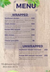 What: Tasty and healthful food options- call in your order: 843.422.3573